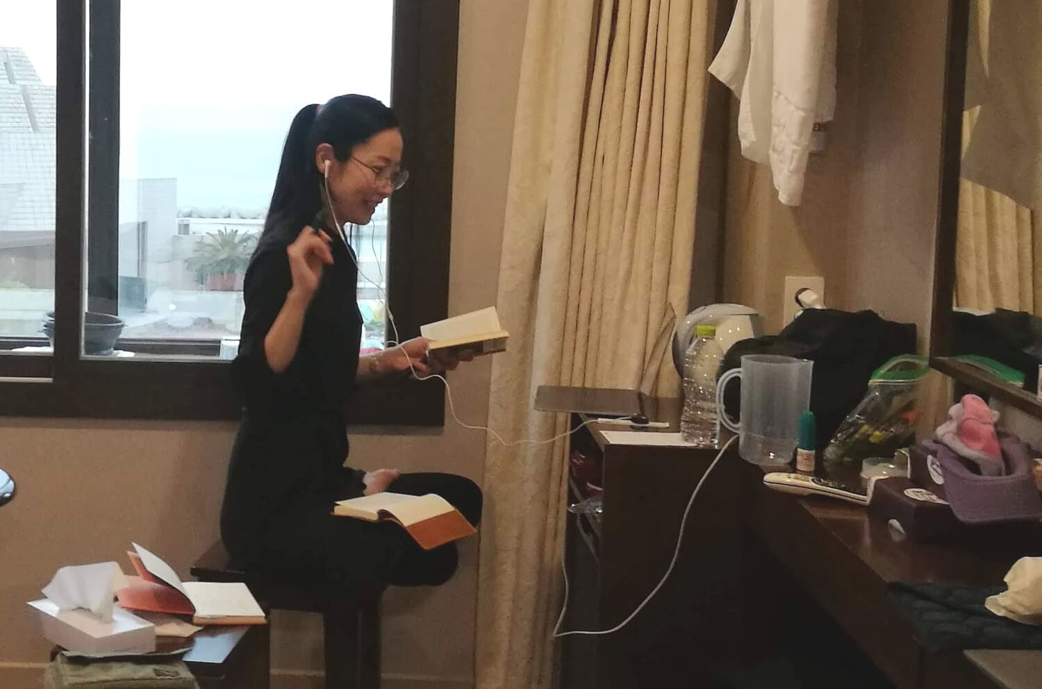 読書や執筆から生まれるテキストを起点に、動きや映像、音へと展開させ、しばしば消滅の危機にある母語ブリヤート語を作品に取り込み、私的領域から公共圏へと解放することでその存続に抗う。