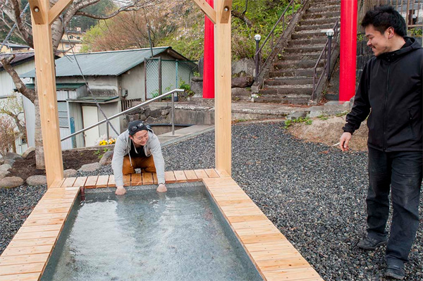 5月2日午後に土湯に到着した、アーティストの阿部乳坊さんと葛谷允宏さん。展示会場を見学後、伝承館や熊野神社など町の見学。夕方はアサヒ写真でこけしの話を聞かせてもらいました。夕食は運営委員で土湯町の住人の今泉さんたちと会食し、翌日は女沼や町の散策をしていきました。写真は、4月にできたばかりの足湯。昨年の歌会始めの儀で、雅子さまが土湯温泉町のミズバショウを詠い、その記念に歌碑と共につくられたものです。「春あさき林あゆめば仁田沼の岸辺に群れてみづばせう咲く」